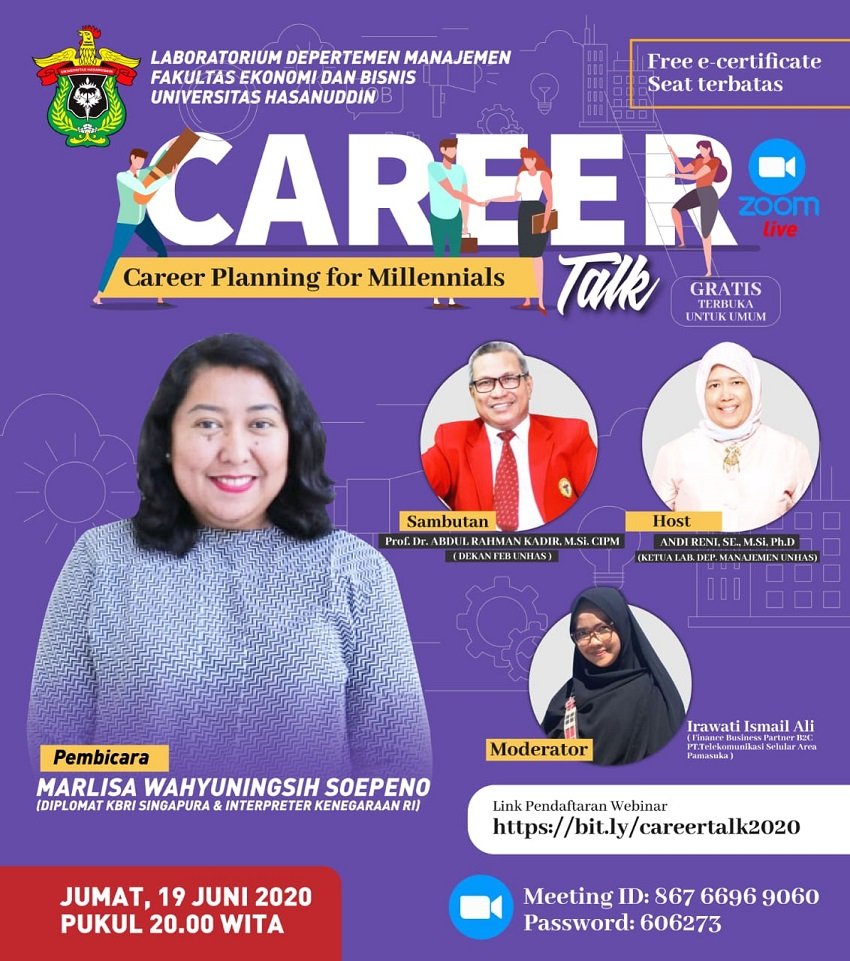Laboratorium Departemen Manajemen Fakultas Ekonomi dan Bisnis Universitas Hasanuddin (FEB Unhas) akan menggelar kegiatan Webinar Career Talk 2020 bertajuk "Career Planning For Millennials".