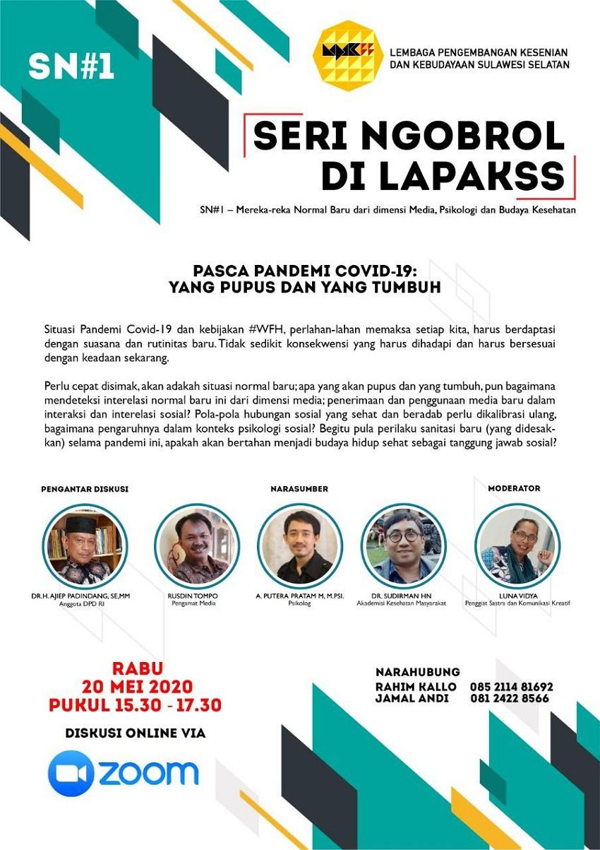 Lembaga Pengembangan Kesenian dan Kebudayaan Sulawesi Selatan (LAPAKKSS) menyelenggarakan Seri Ngobrol (SN) via aplikasi Zoom. Kegiatan ini akan berlangsung Rabu 20 Mei 2020 – pukul 15.30 – 17.00 wita, bertepatan pada Peringatan Hari Kebangkitan Nasional (Harkitnas).