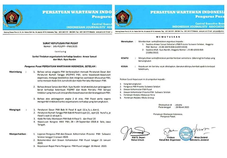 Pengurus Persatuann Wartawan Indonesia (PWI) Pusat memberi sanksi dan tindakan organisasi kepada Sekretaris PWI Sulawesi Selatan (Sulsel), Anwar Sanusi dan seorang anggotanya, Muhammad Ilyas Nurdin, berupa pemberhentian sementara (skorsing) dari keanggotaan PWI Sulsel.