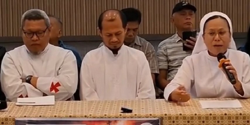 Tangis pecah dalam jumpa pers di Gereja Katedral Medan, Jumat (10/4/2026). Suster Natalia Situmorang mempertanyakan lemahnya pengawasan Bank Negara Indonesia (BNI) yang diduga membuat dana umat senilai Rp28 miliar hilang.