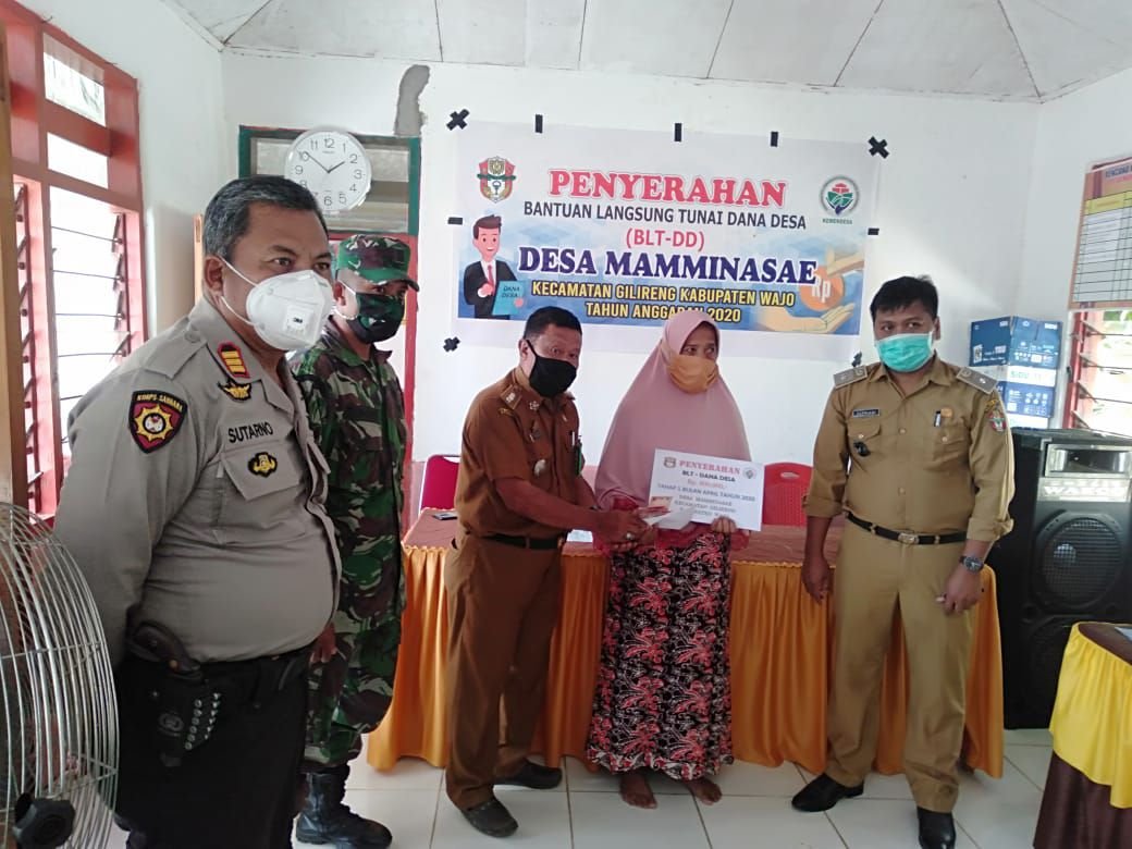 Camat Gilireng, Andi Pammusureng,S.Sos terjun langsung menyerahkan Bantuan Langsung Tunai-Dana Desa (BLT-DD) tahap I bulan April 2020 kepada warga desa yang berhak menerimanya. Pernyerahan BLT-DD di hari kedua, Senin (18/5/2020, berlangsung di Desa Alausalo dan Desa Mamminasae.