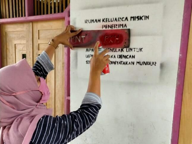 Rumah warga penerima bantuan sosial diberi tanda cat pilox dengan tulisan Keluarga Miskin Penerima Bantuan, Program Keluarga Harapan (PKH) dan BPNT.