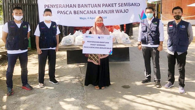 PT PLN (Persero) Unit Induk Wilayah (UIW) Sulselrabar menyerahkan bantuan 300 Paket Sembako untuk warga terdampak banjir di Kabupaten Wajo, Sulawesi Selatan, Rabu (05/08/2020).