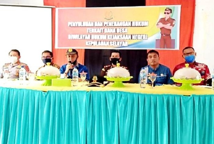 Didampingi Kepala Kejaksaan Negeri Selayar Adi Nuryadin Sucipto, Ketua DPRD. Mappatunru, S.Pd, Camat Pasimasunggu dan Camat Pasimasunggu Timur serta Kapolsek AKP Kaharuddin, Sekda Kabupaten Kepulauan Selayar Dr. IR. H. Marjani Sultan, M.Si membuka penyuluhan dan penerangan hukum terkait dana desa.