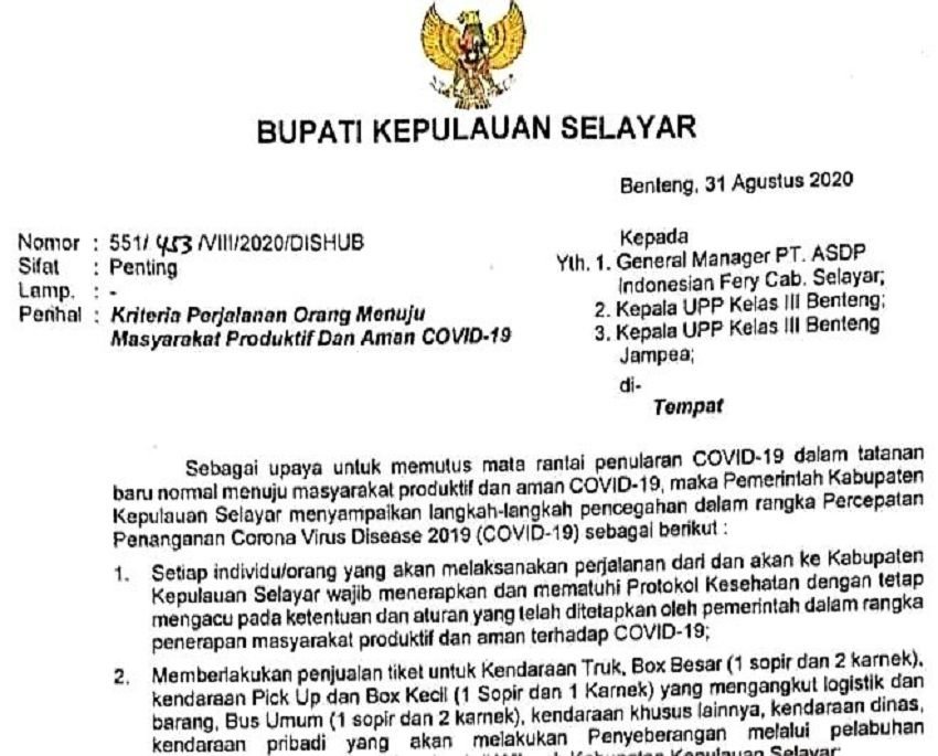 Dalam surat tersebut disampaikan, setiap individu atau orang yang akan melaksanakan perjalanan dari dan akan ke Selayar wajib menerapkan dan mematuhi protokol kesehatan dengan tetap mengacu kepada ketentuan dan aturan yang telah ditetapkan oleh Pemerintah dalam rangka penerapan masyarakat produktif dan aman terhadap Covid-19.