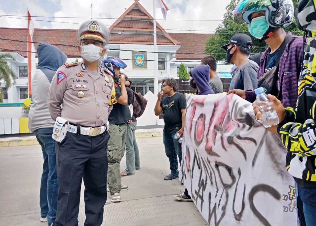 Sebanyak kurang lebih 20 orang mahasiswa yang turun menyuarakan aspirasinya menolak UU Cipta Kerja Omnbus Law berkumpul di Taman Pusaka kemudian berjalan kaki menuju kantor DPRD dengan pengawalan ketat dari personel Polres Kepulauan Selayar bersama personel Polsek Benteng.