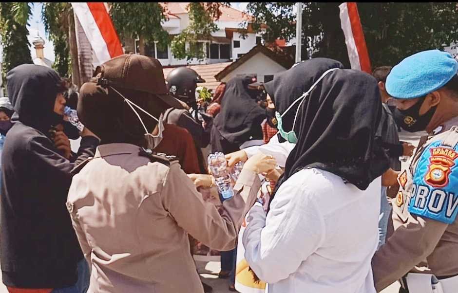 Sembari melaksanakan pengamanan, personel Polres juga membagikan air minum dan masker kepada mahasiswa yang sedang menyampaikan aspirasi di depan Kantor DPRD Kabupaten Kepulauan Selayar.
