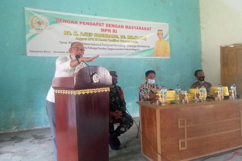 Anggota MPR RI Dr. H. Ajiep Padindang, SE, MM, kembali melakukan Dengar Pendapat Masyarakat (DPM). Kali ini laksanakan di Kecamatan Sibulue Kabupaten Bone dengan tema "Penataan Sistem Hukum Dan Peraturan Perundang-Undangan Berdasarkan Pancasila Sebagai Sumber Segala Sumber Hukum", yang berlangsung berlangsung di Ruang Pertemuan Masyarakat Kecamatan Sibulue (05/11/2020).