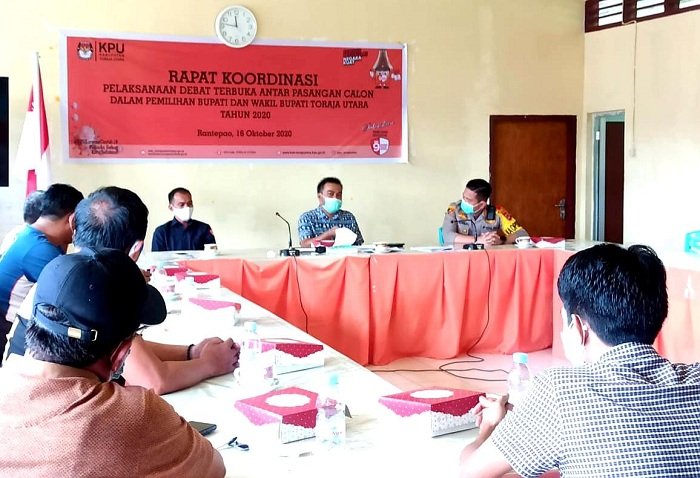 Persiapan jelang pelaksanaan debat publik terbuka untuk ketiga pasangan calon (paslon) Bupati dan Wakil Bupati Toraja Utara terus dilakukan. Dan sebelum debat digelar di Makasar oleh Komisi Pemilihan Umum (KPU) Kabupaten Toraja Utara, dilakukan rapat koordinasi pemantapan terkait pelaksanaan debat paslon tersebut, Senin (16/11/2020) di Kantor KPU Toraja Utara. Rapat koordinasi persiapan pelaksanaan debat paslon dihadiri Kapolres Toraja Utara AKBP Yudha Wirajati, SIK, MH, Ketua KPU Kabupaten Toraja Utara Bonnie Fredom, Kabag Ops Polres Toraja Utara Kompol Marthen Tangallo dan Komisioner KPU Toraja Utara Divisi Sosialisasi, Pendidikan Pemilih, Parmas dan SDM Anshar Tangkesalu.