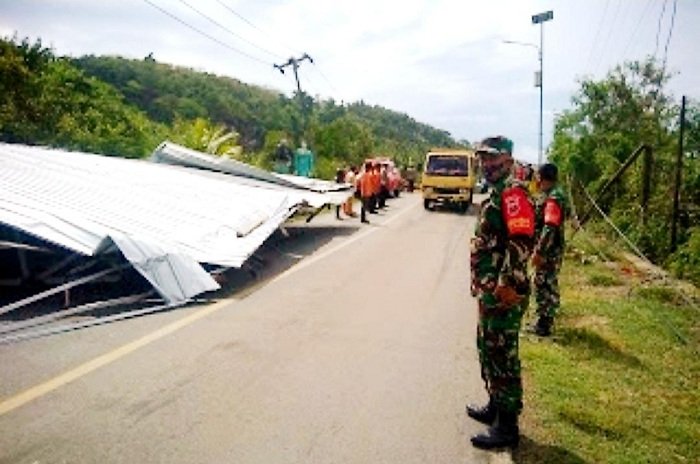 Hujan deras yang mengguyur di beberapa wilayah Kepulauan Selayar disertai dengan angin kencang mengakibatkan atap gudang tersebut terbang hingga 20 meter dari gudang dan menutup bahu jalan poros penghubung antar kota ke desa-desa.
