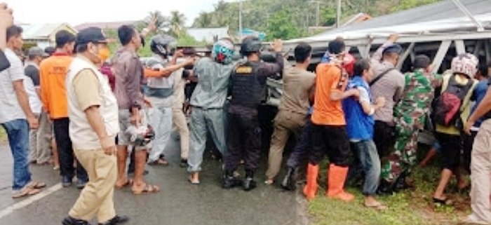 Tim TRC BPBD, Kodim 1415 Selayar, Polres Kepulauan Selayar serta masyarakat setempat saling membantu untuk memindahkan atap gudang tersebut ke sisi jalan.
