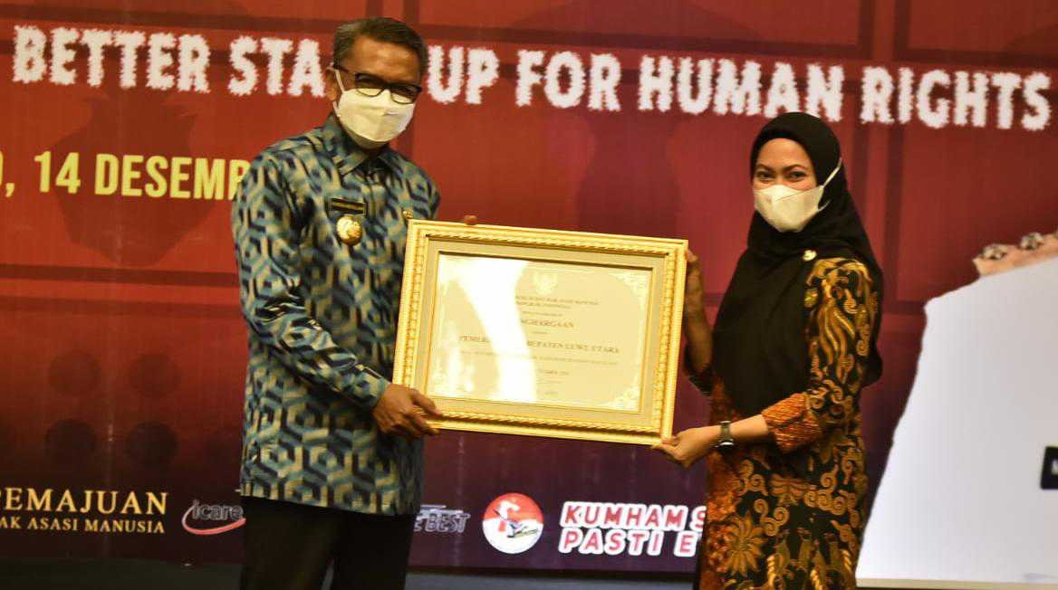 Bupati Luwu Utara Hj. Indah Putri Indriani, kembali menoreh prestasi penghargaan dari Kementerian Hukum dan Hak Asasi Manusia (Kemenkumham) RI yang diserahkan langsung oleh Kepala Kantor Kementerian Hukum dan HAM RI Wilayah Sulsel, Harun Sulianto di Hotel Claro Makassar, Senin (14/12/2020).