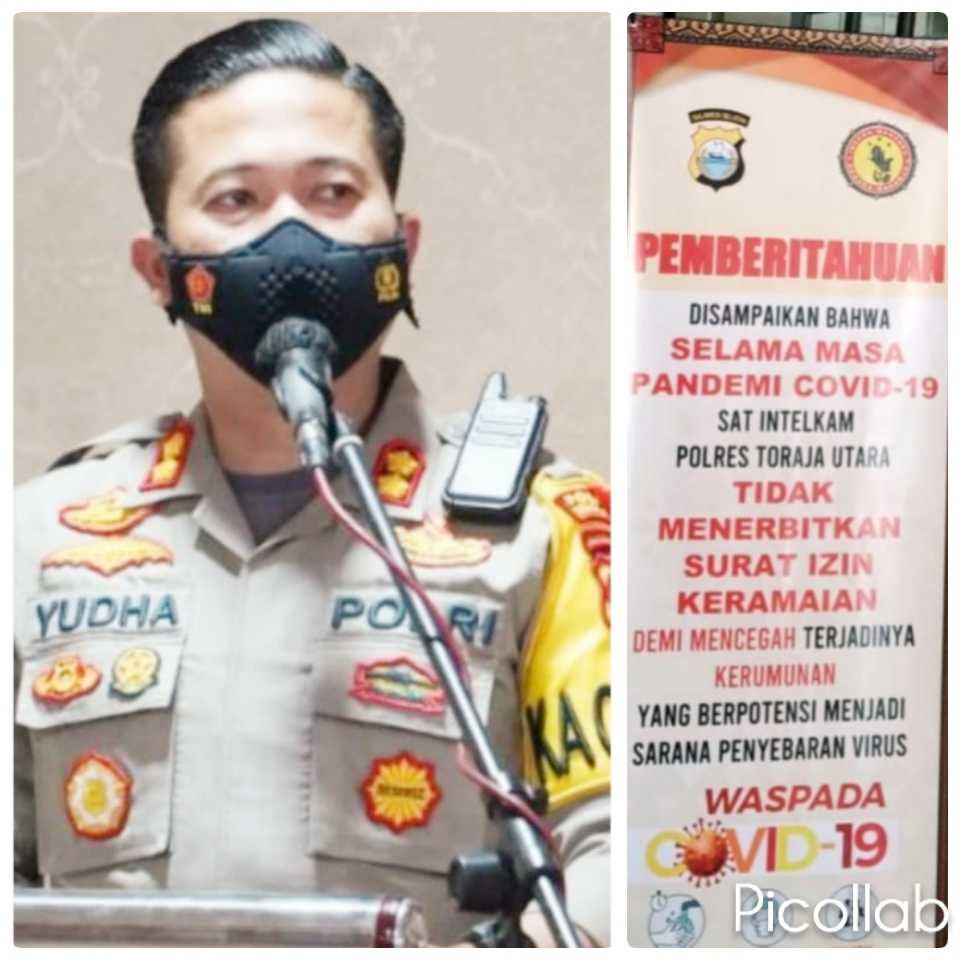 Melalui Surat Nomor B/185/XII/2020, yang ditujukan kepada para Camat di wilayah Kabupaten Toraja Utara, Kapolres Toraja Utara menegaskan, sampai saat ini Polres Toraja Utara tidak menerbitkan izin keramaian terhadap kegiatan masyarakat dalam bentuk apapun guna mencegah terjadinya penyebaran virus Corona pada kerumunan kegiatan masyarakat.