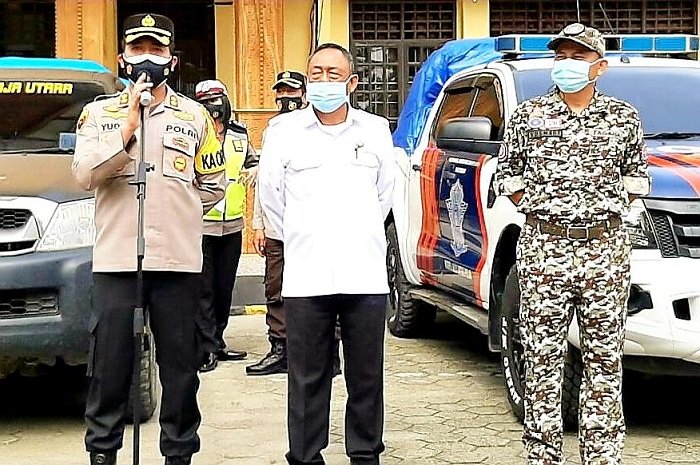 Bupati Toraja Utara Kalatiku Paembonan bersama Kapolres Toraja Utara AKBP Yudha Wirajati di halaman kantor Mapolres Rantepao melepas rombongan dan iring-iringan kendaraan yang membawa bantuan misi kemanusiaan ke Sulawesi Barat (Sulbar), Kamis (21/01/2021).