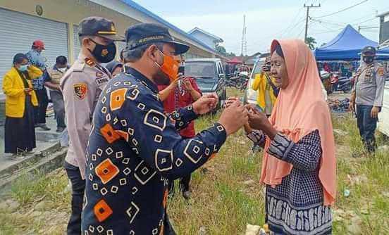 Giat operasi penegakan disiplin protokol kesehatan Covid-19 dipimpin Kepala Dinas (Kadis) Perdagangan Perindustrian Koperasi Usaha Kecil Menengah (P2KUKM) Lutra, H. Drs Muh Kasrum Patawari, M.Si bersama forkopimcam dan mahasiswa KKN.