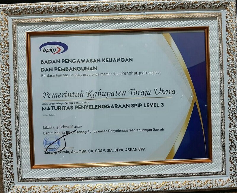 Setelah lima kali berturut-turut nenerima WTP, Bupati Kalatiku Paembonan kembali menerima penghargaan tertinggi Maturitas SPIP Level 3 dari Badan Pengawasan Keuangan dan Pembangunan (BPKP) yang diserahkan oleh Kepala Perwakilan BPKP Sulawesi Selatan di Kantor Perwakilan BPKP Sulsel Jumat, 19 Februari 2021.