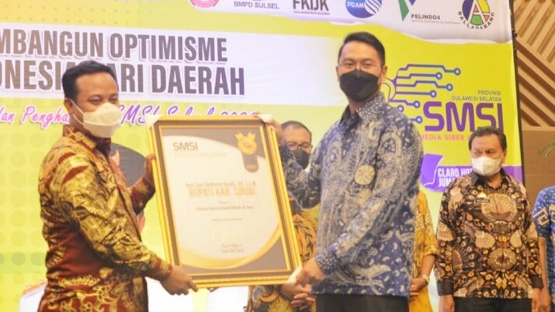 Bupati Sinjai, Andi Seto Asapa (ASA) menerima penghargaan dari Serikat Media Siber Indonesia (SMSI) Sulawesi Selatan (Sulsel), Jumat (26/03/2021).