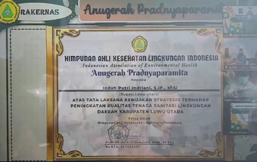 Bupati Luwu Utara Indah Putri Indriani menerima penghargaan anugerah Pradnyaparamita dari Himpunan Ahli Kesehatan Lingkungan Indonesia (HAKLI), secara virtual dari Ketua Umum Hakli, Arif Sumantri, Minggu 11 April 2021.