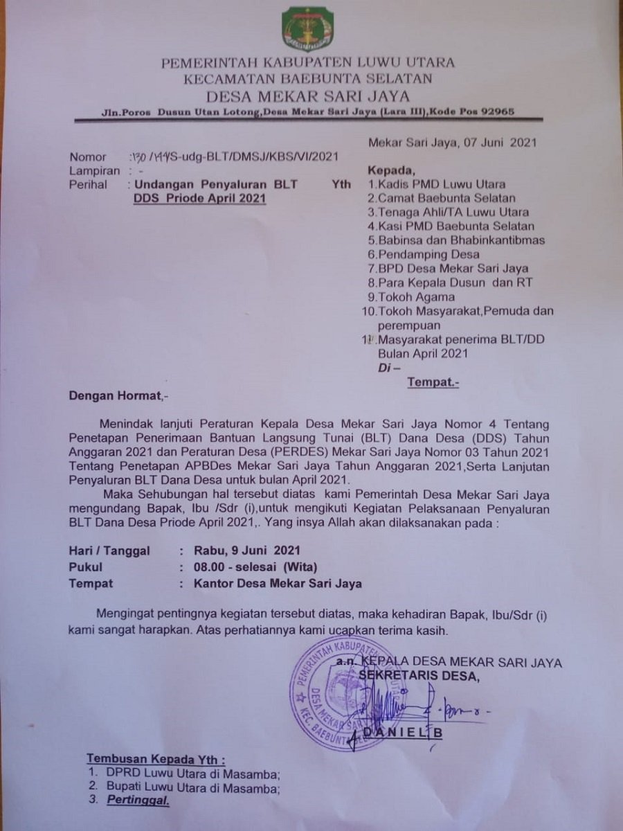 Dan untuk mengurangi dampak tersebut, Pemerintah Desa Mekar Sari Jaya Kecamatan Baebunta Selatan Kabupaten Luwu Utara (Lutra) Sulawesi Selatan (Sulsel), besok Rabu 9 Juni 2021 kembali akan menyalurkan Bantuan Langsung Tunai (BLT) Dana Desa Tahun Anggaran 2021 untuk tahap IV atau bulan April.