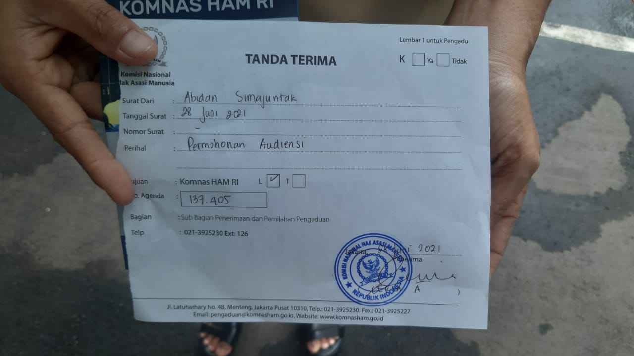 Dengan penuh harap, Abidan Simanjuntak dan Fredy Kurniawan yang juga didampingi isteri masing-masing, mendatangi Komisi Nasional Hak Asasi Manusia (Komnas HAM), Senin (28/06/2021).