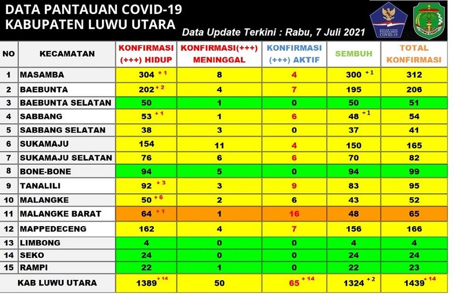 "I Komang Krisna memaparkan bahwa hari ini 14 kasus positif di Luwu Utara, itu terdapat di Kecamatan Masamba 1 orang dari Kelurahan Kappuna, Malangke Barat 1 dari Desa Pao, Baebunta 2 orang satu dari Desa Radda dan satu dari Desa Salulemo. Dari Kecamatan Sabbang 1 orang dari Desa Pararra, Mappedeceng 1 orang dari Desa Cendana Putih II, Tana Lili 3 orang dari Desa Patila serta Kecamatan Malangke 6 orang masing masing 3 dari Desa Putemata dan 3 orang dari Desa Salekoe," terang Jubir Covid-19 Lutra.