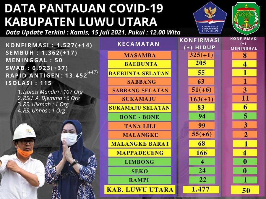 Jumlah warga Kabupaten Luwu Utara yang dikonfirmasi terserang Corona Virus dalam sehari ini bertambah 14 orang. Di Desa Tete Uri Kecamatan Sabbang Selatan 6 warga, menurut data pantauan covid-19 Luwu Utara, Kamis 15 Juli 2021, pukul 12.00 Wita.