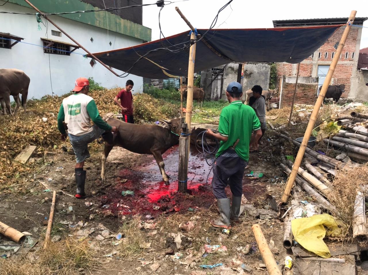 Pemotongan hewan kurban disaksikan langsung Ketua Pembangunan Masjid H Rukman Nawawi bersama masyarakat.