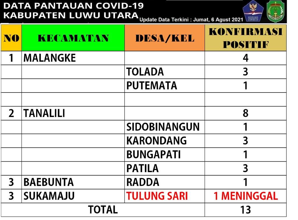 Hal tersebut disampaikan Juru Bicara Satuan Tugas Covid-19 Luwu Utara (Lutra) Sulawrsi Selatan (Sulsel) I Komang Krisna pada media ini via whatsapp mengatakan, lonjakan kasus berasal dari Kecamatan Baebunta 1 pasien, Kecamatan Tana Lili 8 pasien dan 4 pasien dari Kecamatan Malangke.