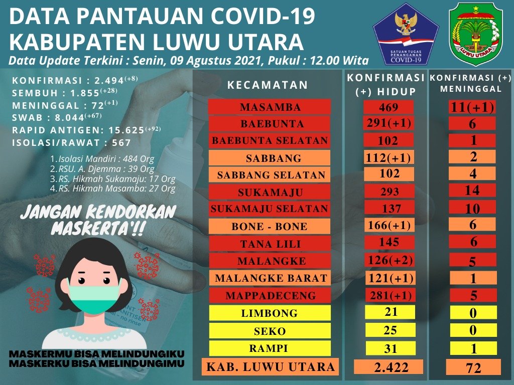Lebih lanjut, Komang menjelaskan dari 567 pasien yang diisolasi, 39 pasien dirawat di RSUD Andi Jemma Masamba, 27 pasien dirawat di RS Hikmah Masamba, 17 pasien dirawat di RS Hikmah Sukamaju dan 484 pasien diisolasi mandiri. Dan yang di Swab 67 orang serta dirapid antigen 92 orang.