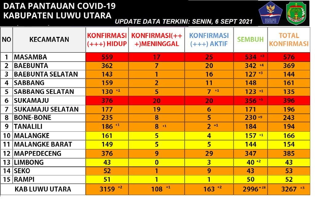 "Hari ini disampaikan Jubir Covid-19 bahwa, sesuai data pantauan Corona Virus Lutra, hari Senin 6 September 2021 pukul 12.00 Wita, bahwa yang masih di rawat/diisolasi 163 pasien," sebutnya.