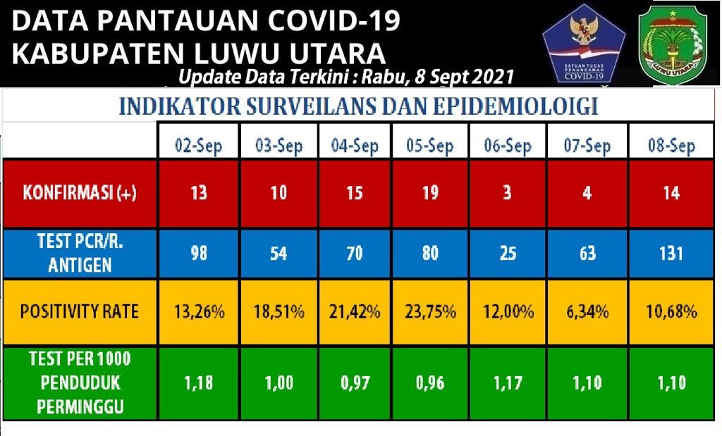 Satuan Tugas (Satgas) Percepatan Penanganan Corona Virus I Komang Krisna, SKM, M.Kes selaku Juru Bicara (Jubir) Covid-19 Luwu Utara (Lutra) Sulawesi Selatan (Sulsel), menyebut bahwa, untuk kasus sudah mulai melandai dengan berdasar pada data pantauan corona virus hari ini, Rabu 8 September 2021 pukul 12.00 Wita sudah 6 (enam) kecamatan turun menjadi zona kuning.