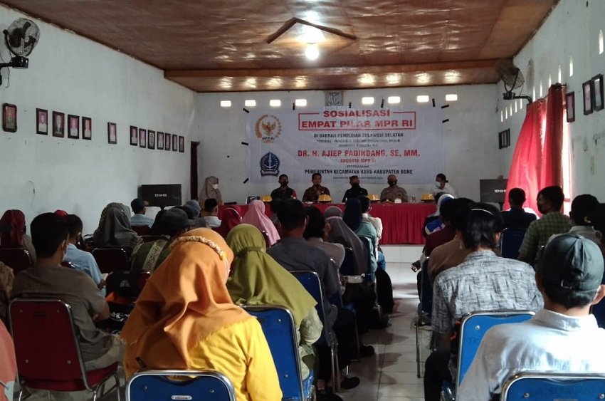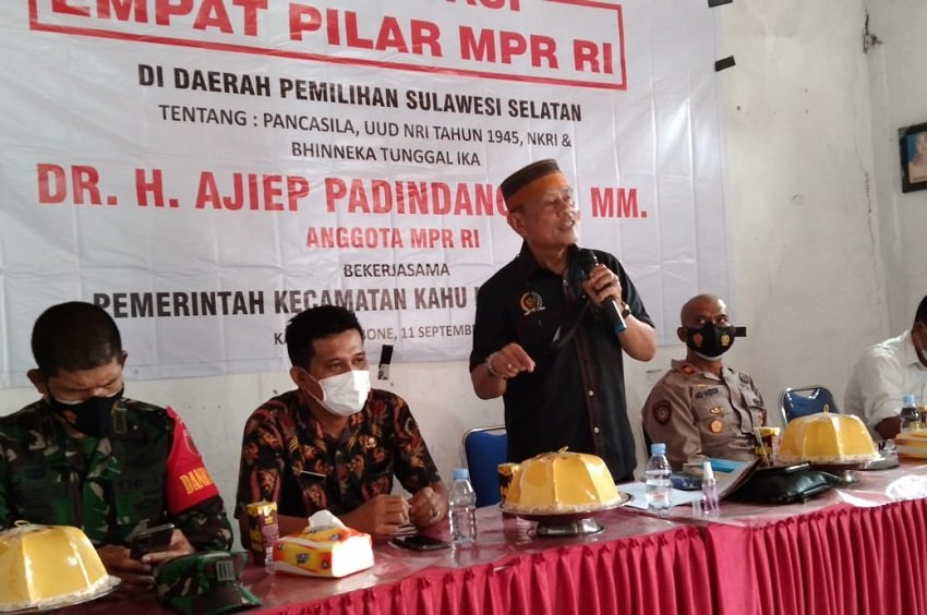 Anggota MPR RI Dr.H.Ajiep Padindang, SE.,MM., melaksanakan Sosialisasi Empat Pilar MPR RI yakni Pancasila, UUD NRI Tahun 1945, NKRI, dan Bhinneka Tunggal Ika, ke Anggota Badan Permusyawaratan Desa (BPD) yang dilaksanakan di Aula PGRI Kecamatan Kahu, Kabupaten Bone (11/09/2021). Kegiatan ini diikuti 150 orang peserta dengan menerapkan standar protokol kesehatan.