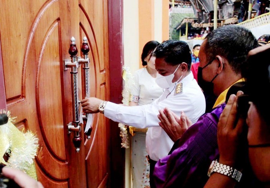 Bupati Toraja Utara Yohanis Bassang., menghadiri pentahbisan gedung gereja Pantekosta serikat di Indonesia yang rangkaian dengan pemotongan pita oleh Bupati dan dampingi pendeta, Marthen Kalitu',S.Th, M.pd Berlangsung di Kecamatan Rindingallo, Lembang Bulullangkan, Rabu 15/12/2021.