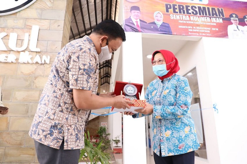 Bupati Bantaeng, Ilham Syah Azikin didampingi unsur Forkopimda dan sejumlah Kepala OPD menerima kunjungan Anggota DPR RI, Azikin Solthan dan Dirjen Penguatan Daya Saing Produk Kelautan dan Perikanan KKP, Artati Widiarti untuk meresmikan Sentra Kuliner Ikan (Senkul) di Pusat Kuliner Pantai Seruni, Bantaeng, Jum'at (20/05/2022).