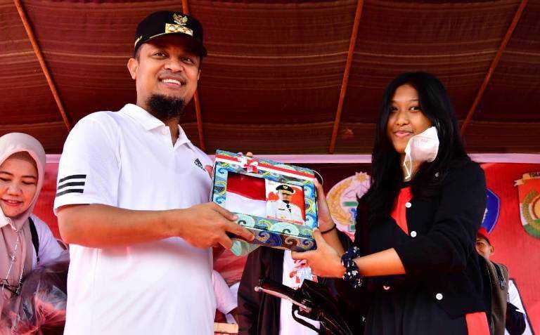 “Hadiah motor saya yang tarik, sepeda Pak Bupati yang tarik. Merdeka Belajar, Cerdaski, Anti Mager - Anti Malas Gerak, nomor undiannya, tapi kita meoli komi, meoli komi, tole pi pissan pa (berteriak, ulangi-ulangi lagi, sekali lagi). Nomornya 0085," kata Andi Sudirman.