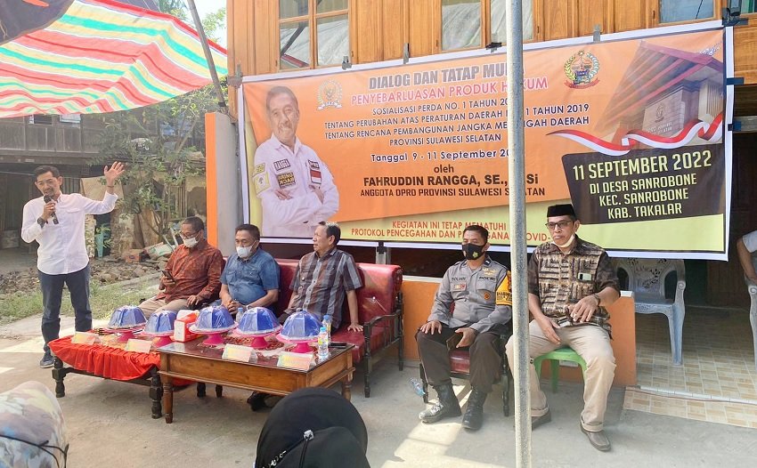 Anggota DPRD Provinsi Sulawesi Selatan Fahruddin Rangga, SE., M.Si dari Fraksi Golongan Karya kembali melanjutkan tugas konstitusinya di Desa Sanrobone Kecamatan Sanrobone Kabupaten Takalar, Minggu (11/09/2022) pagi tadi pelaksanaan titik kedua Penyebarluasan Produk Hukum Daerah terkait Peraturan Daerah Nomor 1 Tahun 2021 tentang Perubahan Atas Perda Nomor 1 Tahun 2019 tentang Rencana Pembangunan Jangka Menengah Daerah Provinsi Sulawesi Selatan 2018-2023.