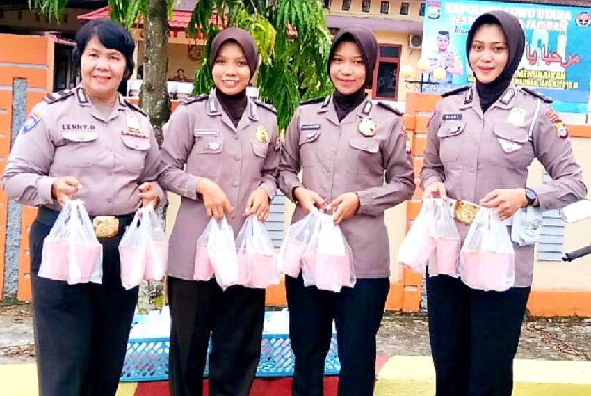 Polisi Wanita (Polwan) Polres Luwu Utara (Lutra) membagikan takjil di depan Kantor Mapolres Luwu Utara, Masamba, Jalan Ahmad Yani Kelurahan Kappuna, Minggu (26/05/2019).