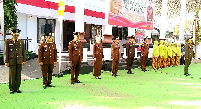 Bertindak sebagai Komandan Upacara, Sakir Saripuddin, SH, dengan peserta upacara terdiri dari pejabat lingkup Kejari, diantaranya Kasi Pidum M. Junaidi Gasal, SH, Kasi Pidsus Juniardi Windraswara, SH, MH, Kasi Intel Tryo Jatmiko, Kasi Datun Ridwan Ammy Putra, SH, serta Ketua Dharmakarini Ny. Yuri Cumondo bersama anggota.