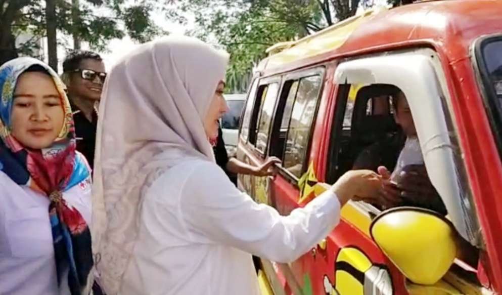 Membagikan bunga dan brosur kepada masyarakat, sopir mobil dan pengendara roda dua di jalanan dalam rangka peringatan Hari AIDS Sedunia (HAS) 2019, ini yang dilakukan Indah Putri Indriani, Bupati Luwu Utara bersama anggota Palang Merah Indonesia (PMI), Minggu (01/12/2019) disamping rumah jabatan Bupati depan tugu monumen Masamba Affair.