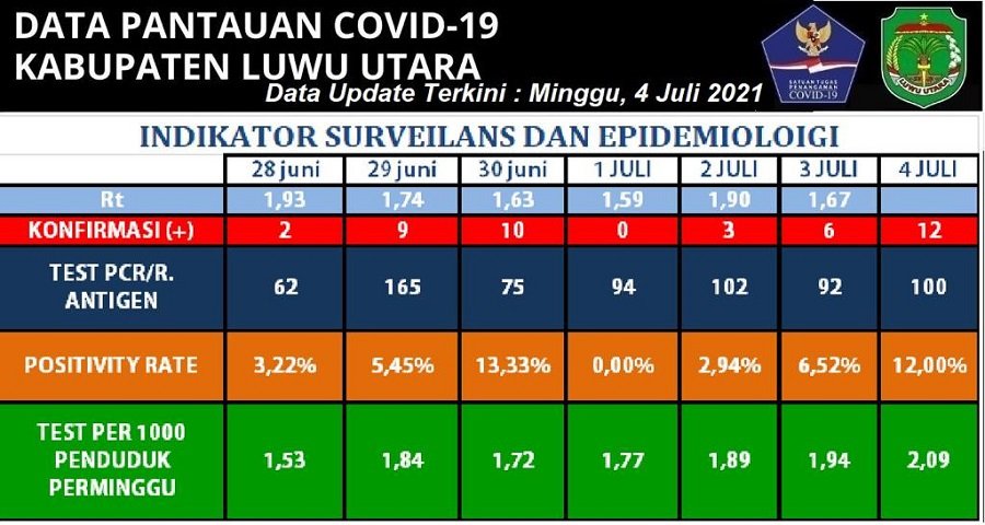 Kondisi kasus Corona Virus di Kabupaten Luwu Utara yang berjukuk Bumi Lamaranginang setiap hari lonjakan virus yang dianggap remeh sebagian masyarakat bertambah hari ini 12 pasien, Minggu 4 Juli 2021.