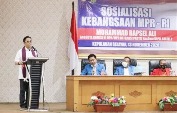 Sosialisasi Wawasan Kebangsaan MPR-RI Muhammad Rapsel Ali, anggota Komisi VI DPR RI Fraksi Partai NasDem Dapil Sulsel 1 membidangi BUMN, Perindustrian, Perdagangan, UMKM bekerjasama KNPI Selayar berlangsung di ruang pola Kantor Bupati Kepulauan Selayar, Jumat (13/11/2020).