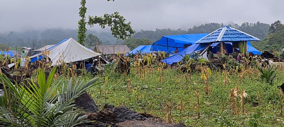 Hamparan ratusan hektare kebun kelapa sawit yang baru dibuka di Desa Meli, Kecamatan Baebunta, Luwu Utara menjadi lokasi pembangunan puluhan tenda untuk pengungsi korban bencana banjir bandang Masamba, Jumat (17/7/2020).