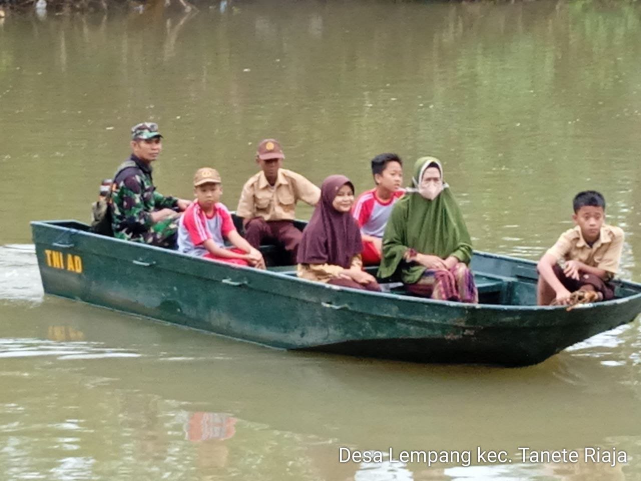 Bentuk kepedulian pada warganya, Babinsa Koramil 1405-08/Tanete Riaja membantu masyarakat dan anak-anak sekolah yang hendak menyeberangi Sungai Pesse yang selama ini akses terputus akibat jembatan rusak yang bertempat di Dusun Pesse, Desa Lempang, Kecamatan Tanete Riaja, Kabupaten Barru.