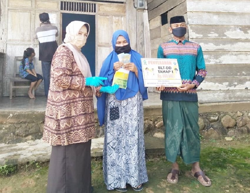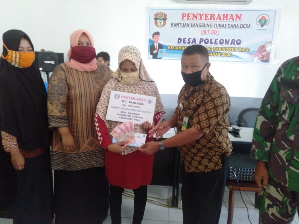Sebagai langkah percepatan penanggulangan Covid-19, khususnya di pedesaan, Pemerintah Desa Poleonro, Kecamatan Gilireng, Kabuapten Wajo, Sulawesi Selatan, Jumat (15/5/2020), menyerahkan Bantuan Langsung Tunai Dana Desa (BLT-DD) tahap I bulan April 2020 kepada warga desa yang berhak menerimanya.