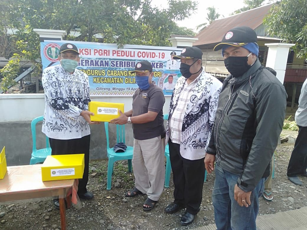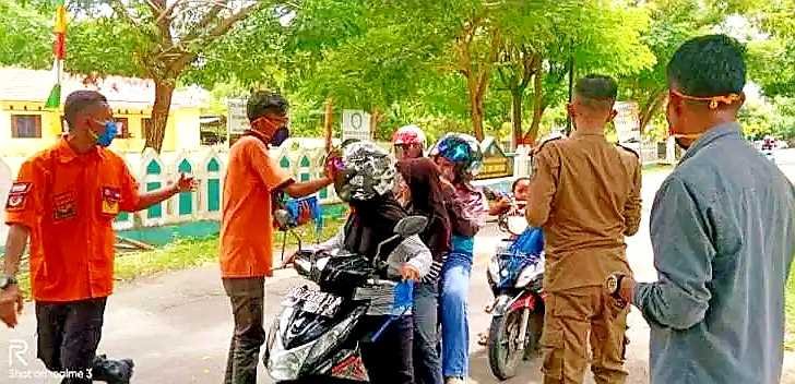 Pengurus Persatuan Guru Republik Indonesia (PGRI) Kabupaten Wajo, Sulawesi Selatan, touring ke kecamatan membagi masker gratis kepada masyarakat.