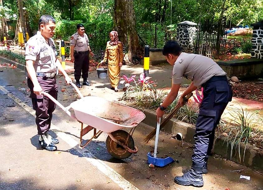 Kapolsek Tinggimoncong Iptu Hasan Fadhlyh, SH bersama Wakapolsek Tinggimoncong Iptu Herman Catur, Kanit Sabhara Ipda Haris, Kanit Provos Aipda Bohari dan masyarakat di sekitar Jalan Endang melaksanakan kerja bakti pasca pelaksanaan Road Race A'Kio, Senin (16/03/2020).