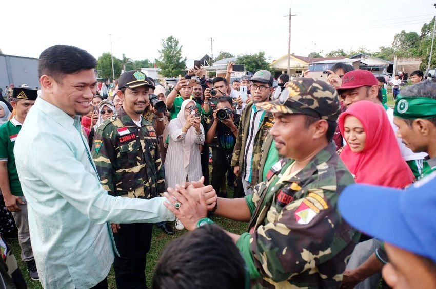 Bupati Gowa, Adnan Purichta Ichsan menyambut rombongan peserta Long March Gerakan Pemuda Ansor Sulawesi Selatan dalam rangka Hari Lahir Nahdatul Ulama ke-94 Tahun 2020 di Lapangan Pemuda, Dusun Teamate, Desa Pallantikang, Kecamatan Pattalassang, Kabupaten Gowa, Minggu (02/02/2020) sore.