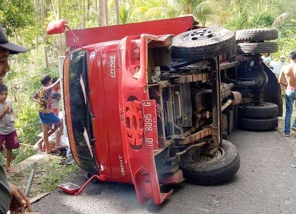 Mobil Truck bernomor polisi DD 8095 G dengan muatan pupuk kurang lebih 10 ton mengalami kecelakaan di jalan yang menghubungkan Desa Maharayya - Desa Onto tepatnya di pendakian Kalimboro pada Rabu (11/12/2019) siang sekitar pukul 15.00 Wita.