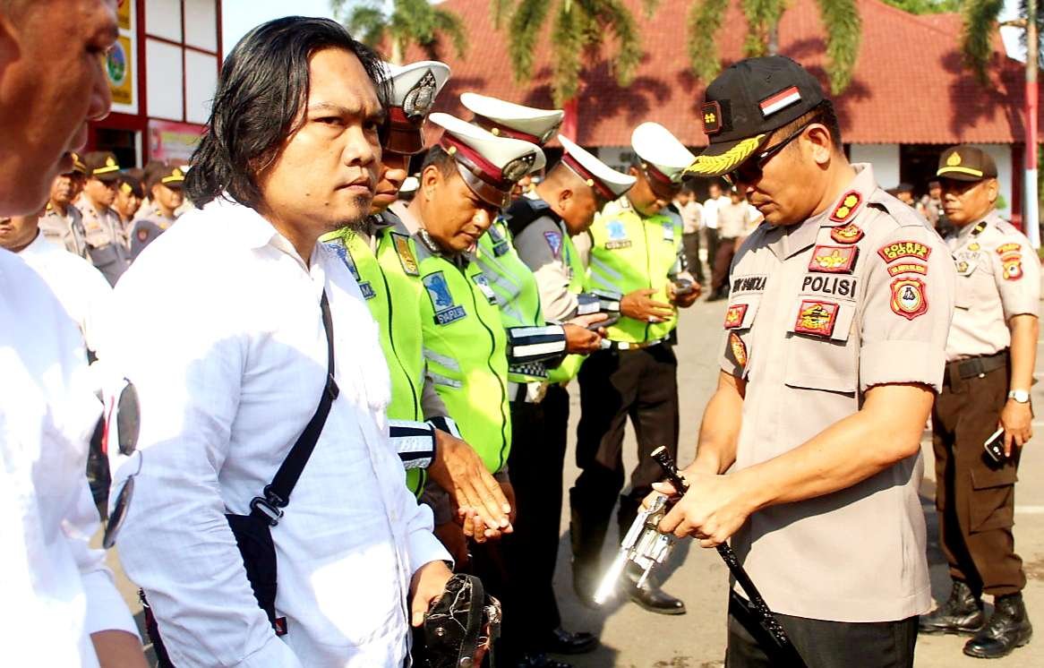 Kapolres Gowa AKBP Boy FS Samola, SIK, MH saat memimpin pelaksanaan apel kesiapan pengamanan aksi unjuk rasa dalam rangka memperingati Hari Anti Korupsi sedunia, melakukan pemeriksaan senjata api milik personil yang terlibat pelaksanaan pengamanan.