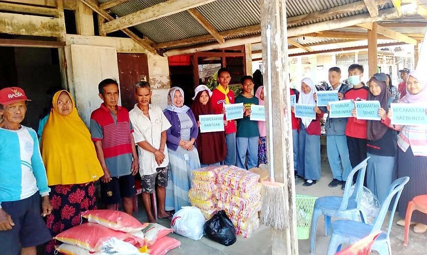 Forum Komunikasi (Forkom) Kecamatan Sehat bersama OSIS SMAN 3 Baebunta dan Palang Merah Indonesia (PMI) Luwu Utara (Lutra) menyerahkan sumbangan sosial kepada lima korban kebakaran di Dusun Cempaka, Desa Beringin Jaya, Kecamatan Baebunta Selatan, Kabupaten Luwu Utara.